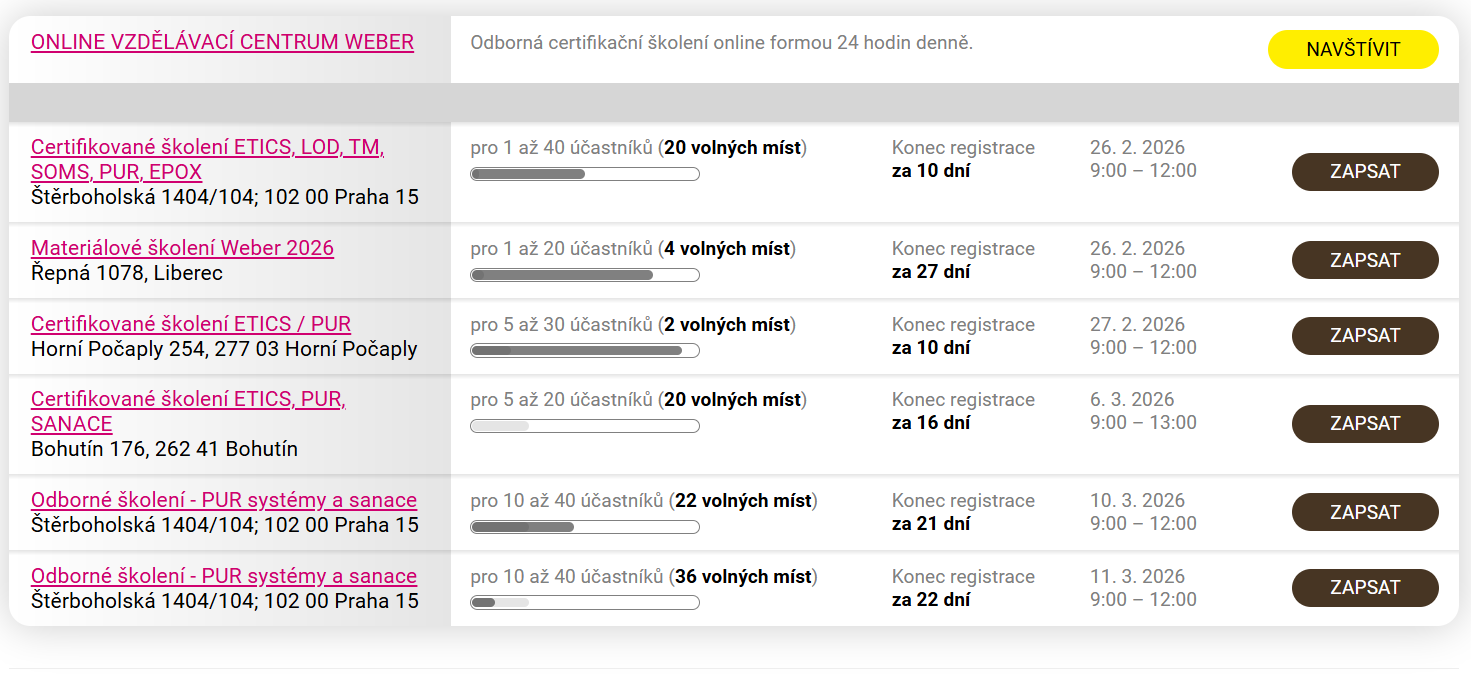 Profiklub otevírá nové termíny odborných školení pro realizační firmy a řemeslníky. Pokud chcete mít jistotu správné aplikace systémů Weber, zlepšit kvalitu své práce a získat praktické know-how přímo od odborníků, právě teď je ten správný čas se přihlásit.