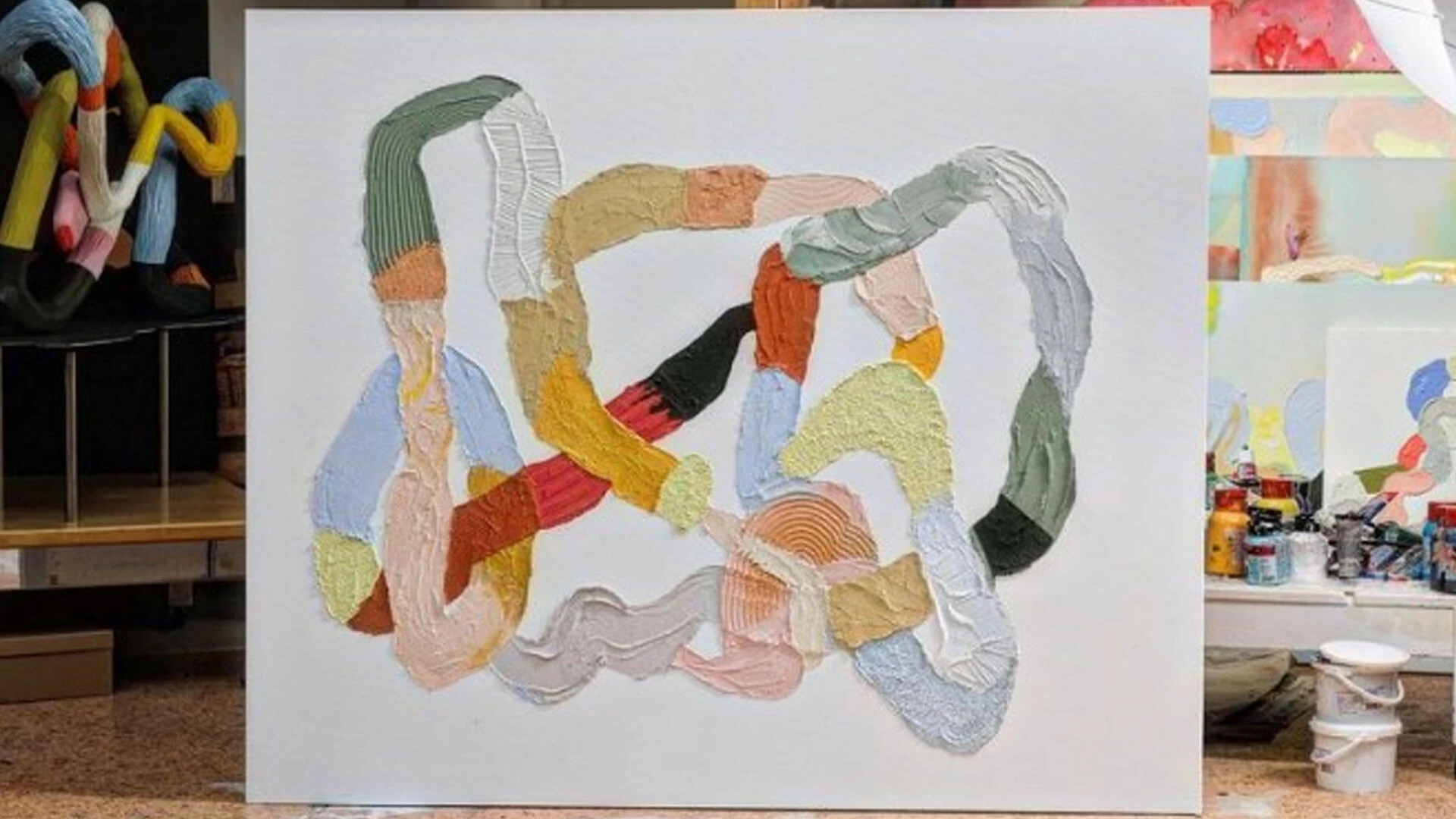 Průřez tvorby reprezentují nejen kombinované techniky na plátně, ale také dva výsostně dominantní solitéry, vytvořené technologií 3D Print Weber Concrete.