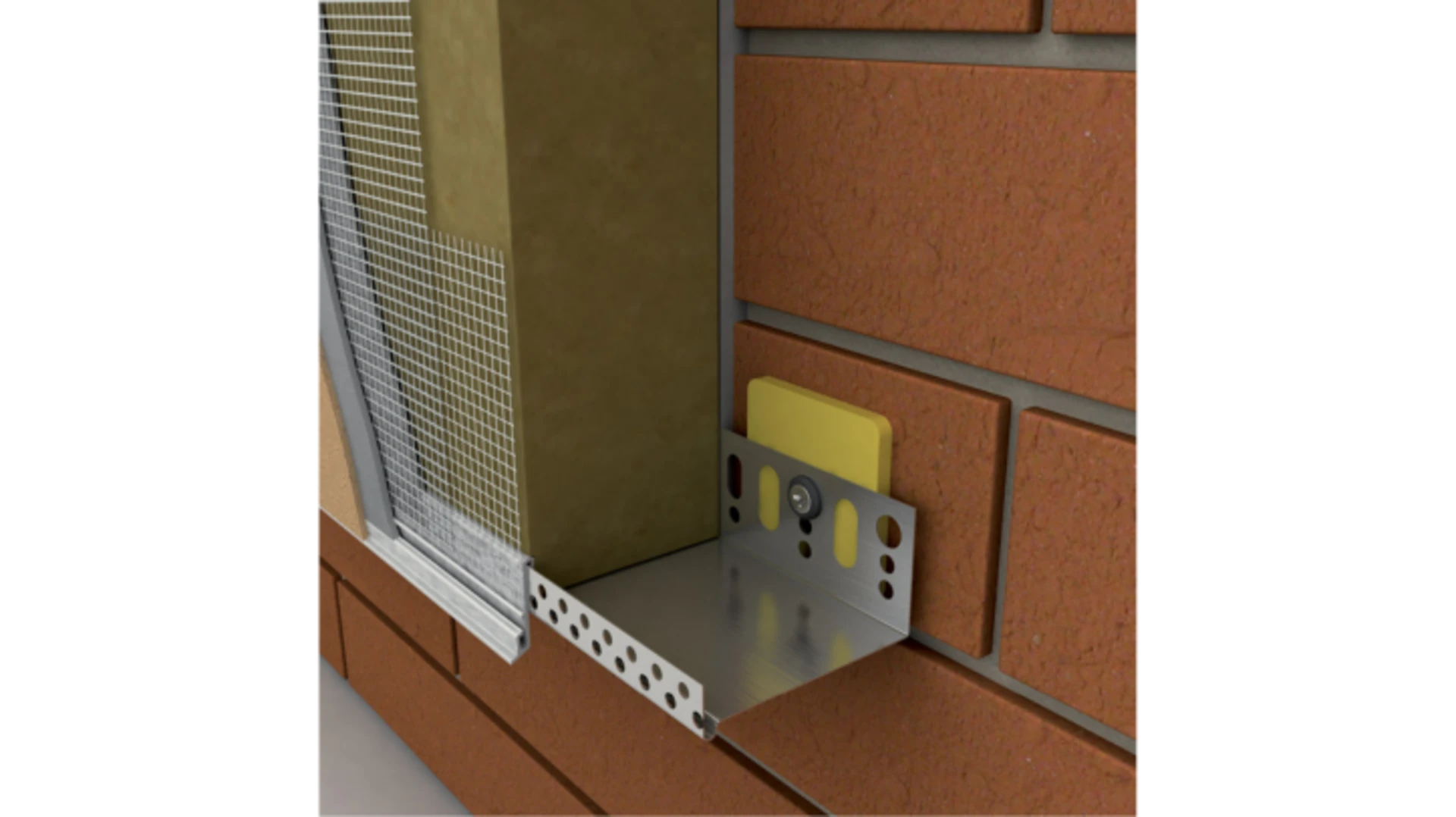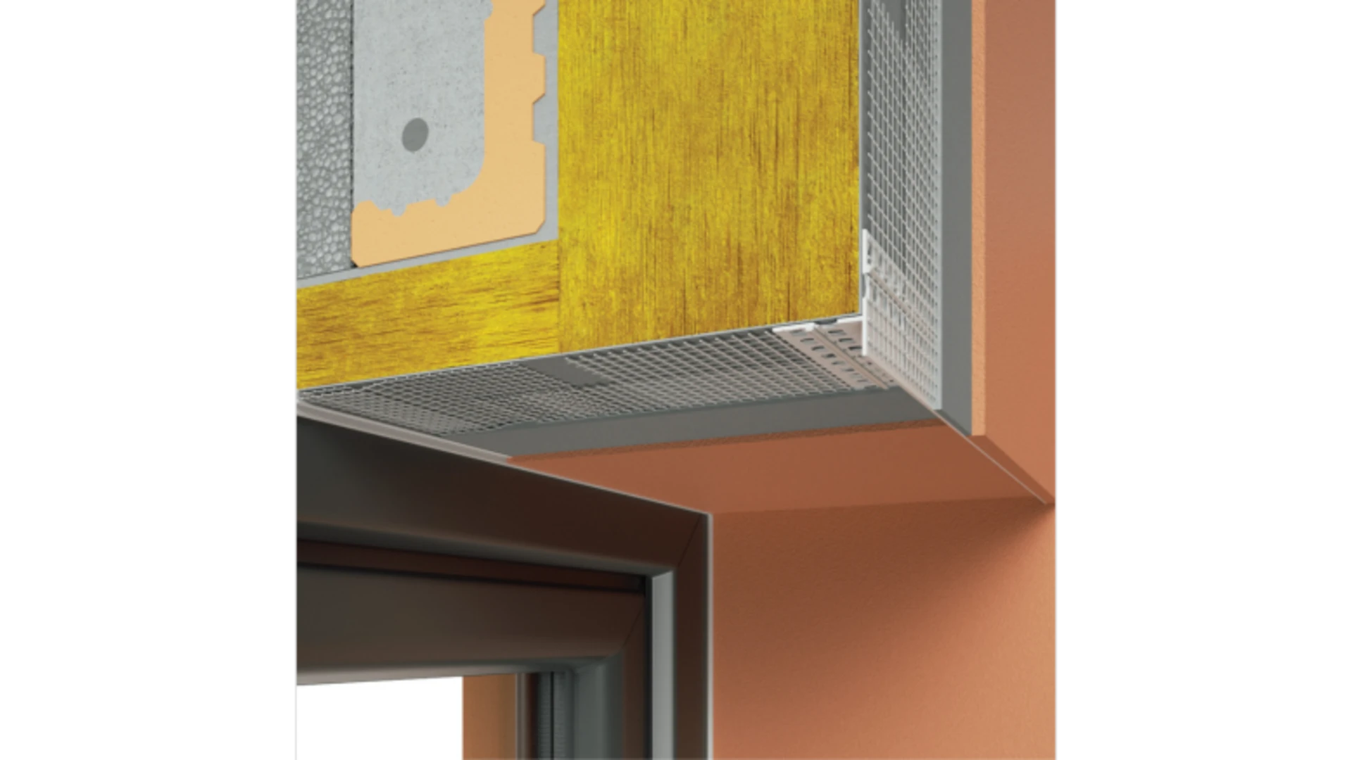 Plastový ukončovací profil se skleněnou síťovinou. Profil vytváří ve 3 směrech dilatující připojení ETICS k vodícím lištám žaluzií nebo rolet.