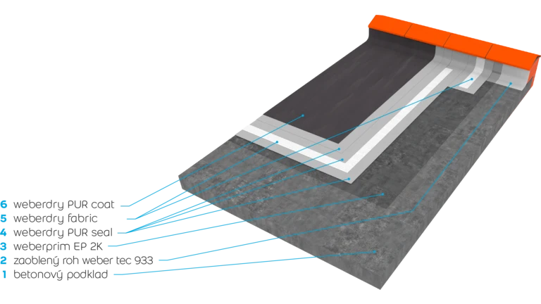 po provedení povlaku weberdry PUR seal, a to ve 2 vrstvách pomocí válečku, štětce nebo airless stříkáním. Technologická přestávka mezi jednotlivými vrstvami je 3–6 hod., ne déle než 36 hod. Vzhledem ke skutečnosti,