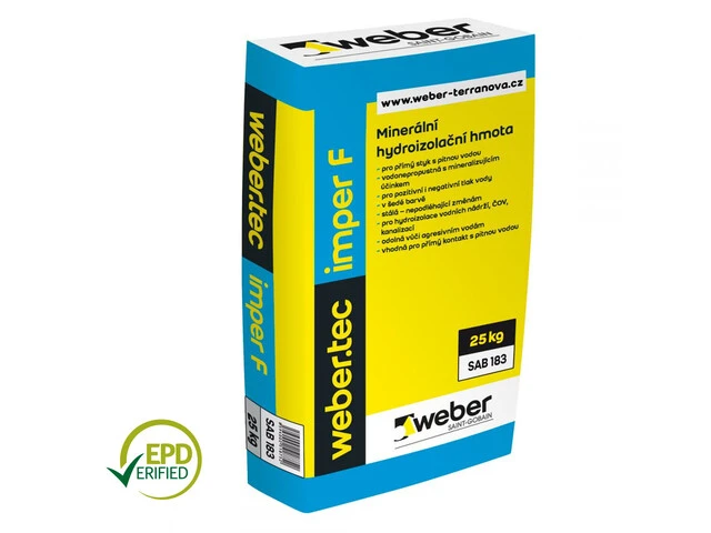 Pro utěsnění betonu proti průniku vody a jiných kapalin aplikujeme osmotickou hydroizolační maltu s hloubkovým mineralizačním účinkem webertec Imper F. Malta utěsní betonovou konstrukci proti pozitivnímu i negativnímu tlaku vody. Maltu získáme rozmícháním sypké směsi pomalým elektrickým míchadlem (500 ot./min) v 6 - 7 litrech vody na pytel tak, abychom získali homogenní a řídkou směs s konzistencí nátěrové hmoty. Pomocí štětce nanášíme 1. vrstvu v množství minimálně 2 kg/m2 (natíráme ve vodorovném směru). Ponecháme uschnout minimálně 4 hod. Poté 1. vrstvu navlhčíme a naneseme 2. vrstvu (nejlépe nerezovým hladítkem) se stejnou konzistencí jako 1. vrstva. Celková tloušťka musí být 2 mm. 24 hod. po aplikaci a po dobu 4 dnů natřenou plochu zvlhčujte. Při strojní aplikaci konečnou úpravu proveďte štětcem, hladítkem nebo houbou či molitanem.