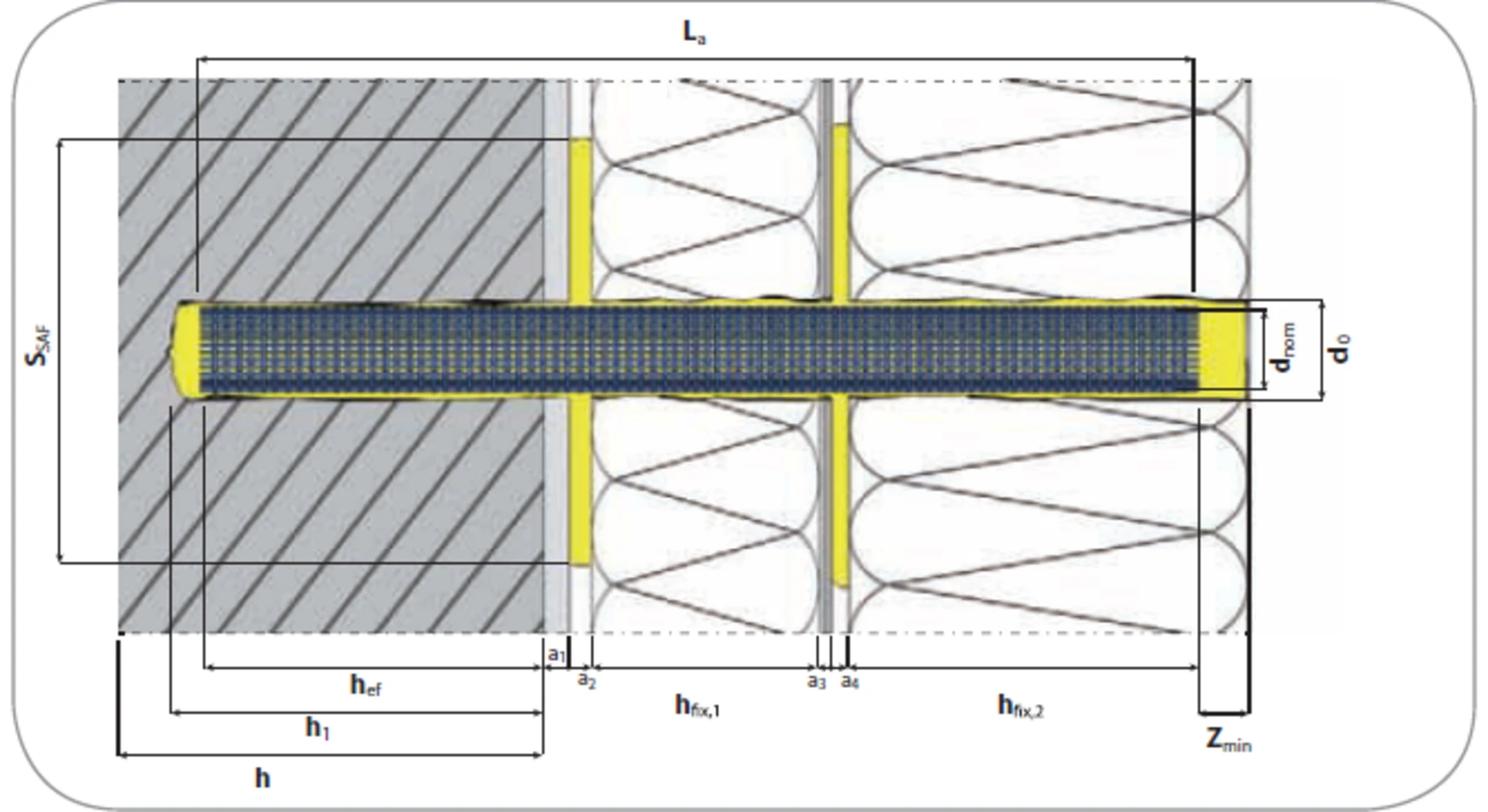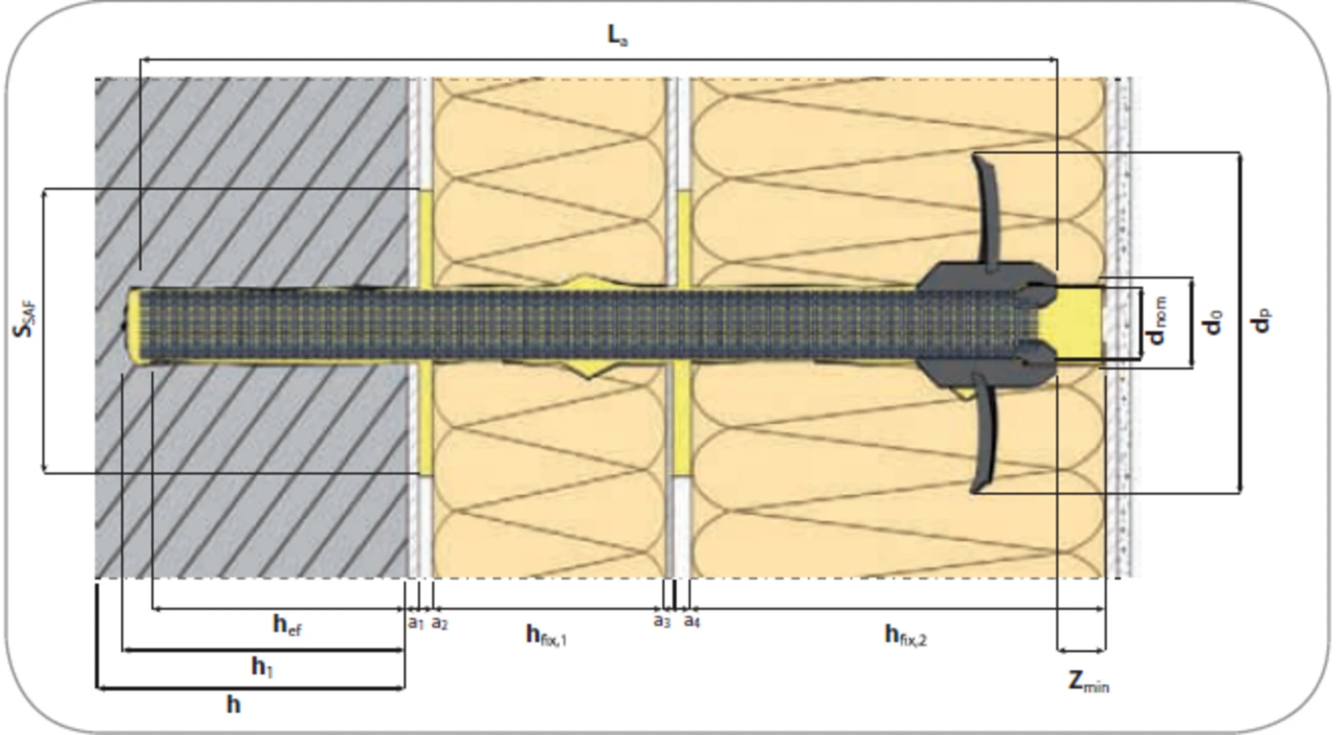 Hmoždinky zajišťují přenos zatížení působící v jejich ose, musí být osazeny vždy, jsou osazeny přes novou tepelně izolační vrstvu a vrstvu stávajícího ETICS a jsou ukotveny do nosného podkladu. Druh, poloha vůči výztuži, počet a rozmístění nových hmoždinek se navrhuje postupem podle ČSN 73 29 02. Pro zdvojení ETICS je nutno použít hmoždinky se šroubovacím ocelovým trnem. Vhodná hmoždinka je např. Termoz CS, která je součástí systémového řešení kotvení při sanaci a zdvojení ETICS od firmy Fischer. Hodnotu Nrk zjistíme výtažnou zkouškou hmoždinek in situ a hodnoty Rjoint a Rpanel najdeme v STO nebo Prohlášení o vlastnostech uvažovaného zateplovacího systému. Použití jiného upevnění není předmětem ETICS weber therm SAN a weber therm SAN mineral.