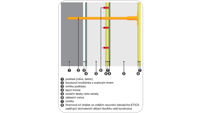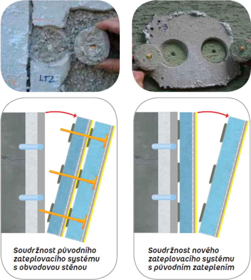 - přenesení plného zatížení na kotvící systém bez ohledu na původní způsob lepení a kotvení ETICS